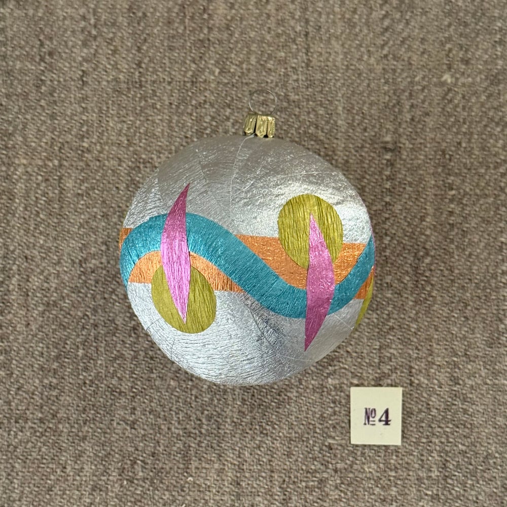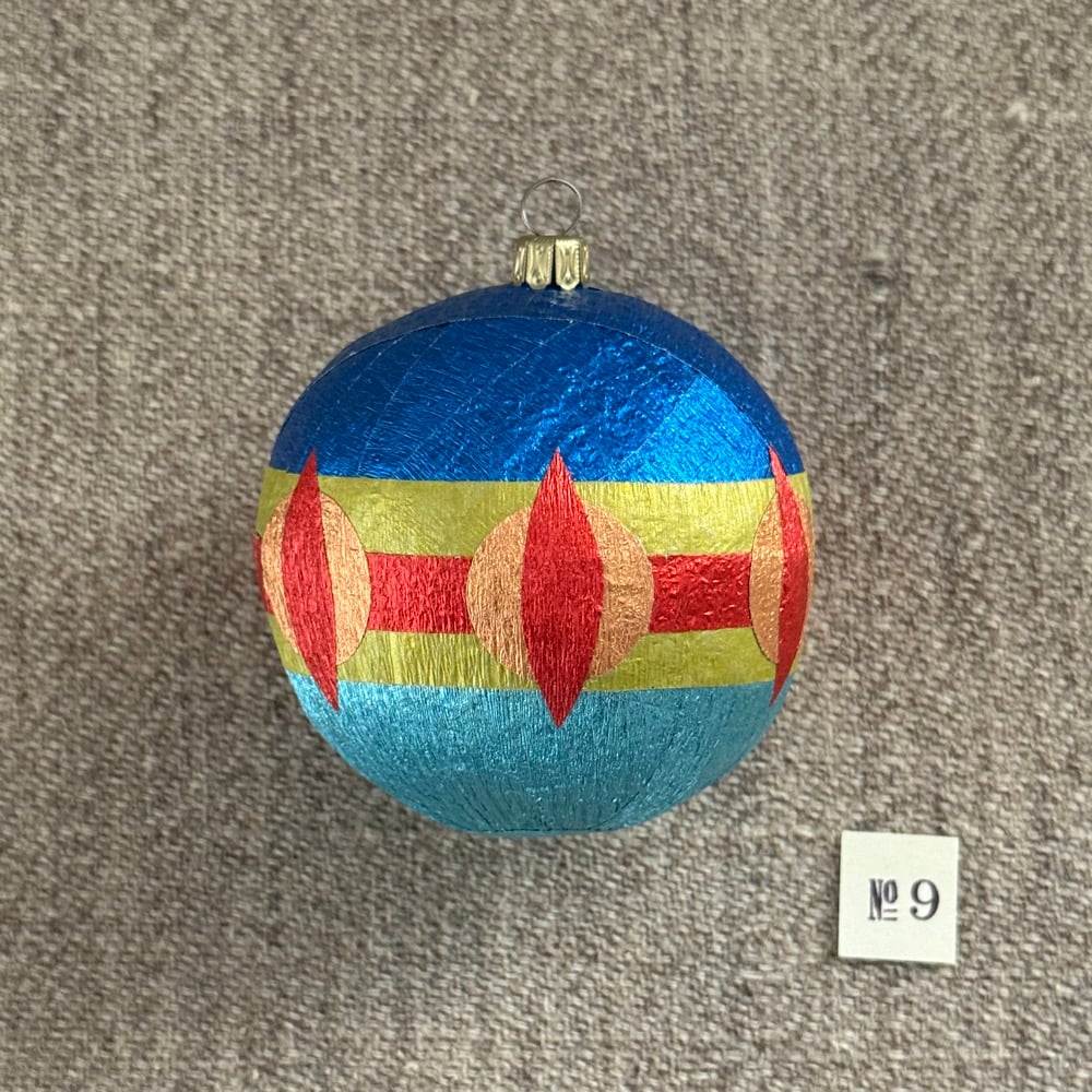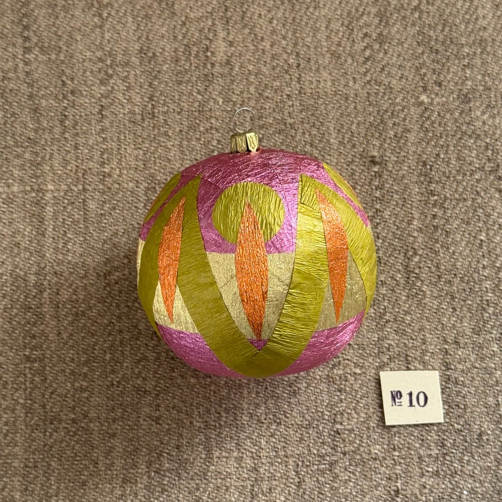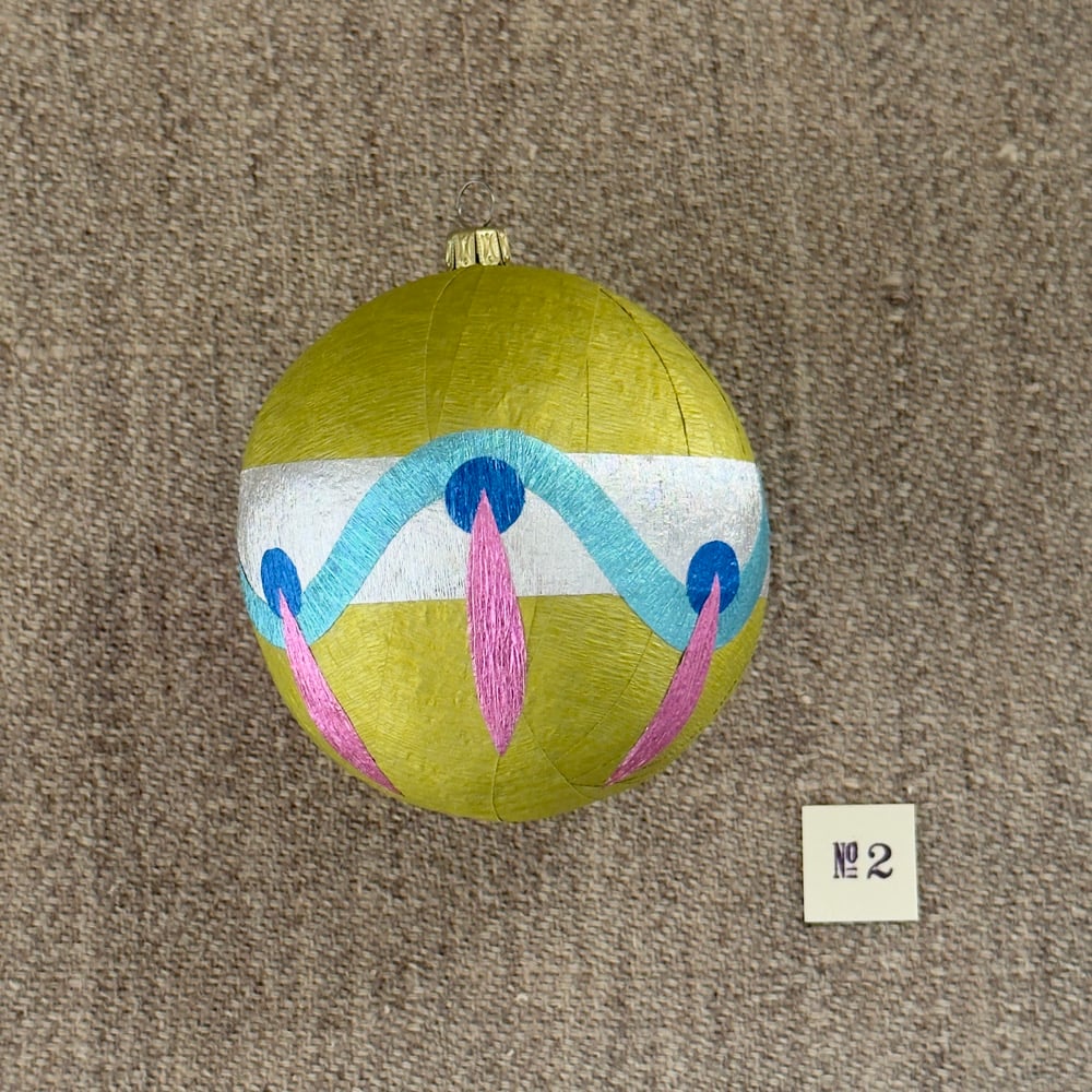 Surprise Balls are sculptural crepe paper party favors. Each one contains ten tiny items. Keep them as they are or unwrap yards of multicolored crepe streamers to reveal the hidden surprises. Each one is handmade by artist Anandamayi Arnold, and no two are completely alike. Ornaments have fancy brass caps with loops for hanging if you wish.